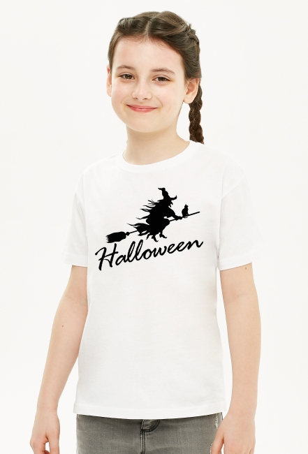 Koszulka dziecięca na Halloween. T-shirt Halloweenowy dla dziewczynki. Czy Twoja córka chce koniecznie być złą czarownicą w Halloween? Zamów koszulkę dla dziewczynki specjalnie na Halloween z wiedźmą lecącą na miotle i napisem Halloween. Polecamy!